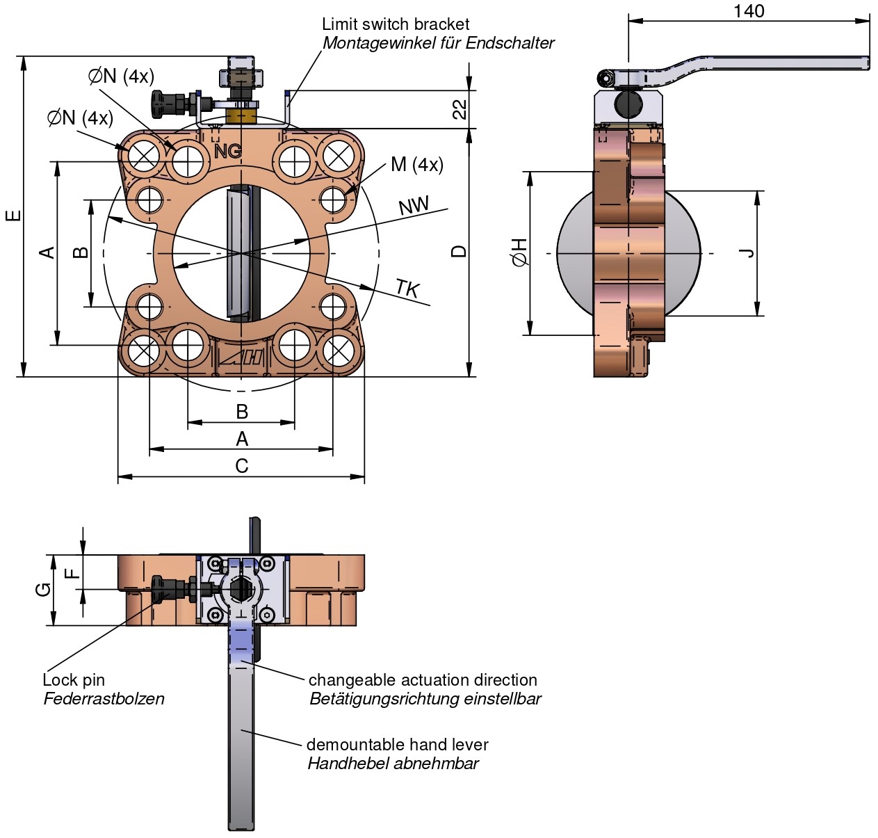 A direção do manuseio da válvula pode ser ajustada (em sentido horário ou anti-horário) ao se girar o suporte da alavanca. Esteja ciente que a válvula borboleta só pode ser aberta se estiver montada e com vedação lubrificada ou engraxada. O flange adaptador só pode ser soldado com a válvula borboleta desmontada.