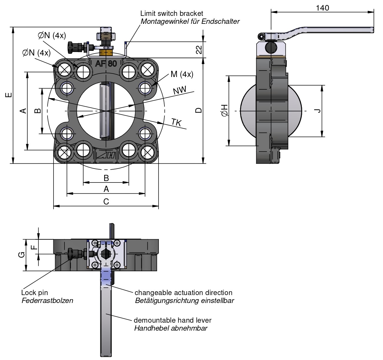 A direção do manuseio da válvula pode ser ajustada (em sentido horário ou anti-horário) ao se girar o suporte da alavanca. Esteja ciente que a válvula borboleta só pode ser aberta se estiver montada e com vedação lubrificada ou engraxada. O flange adaptador só pode ser soldado com a válvula borboleta desmontada. Entre em contato conosco para mais informações via vendas@asahidraulica.com